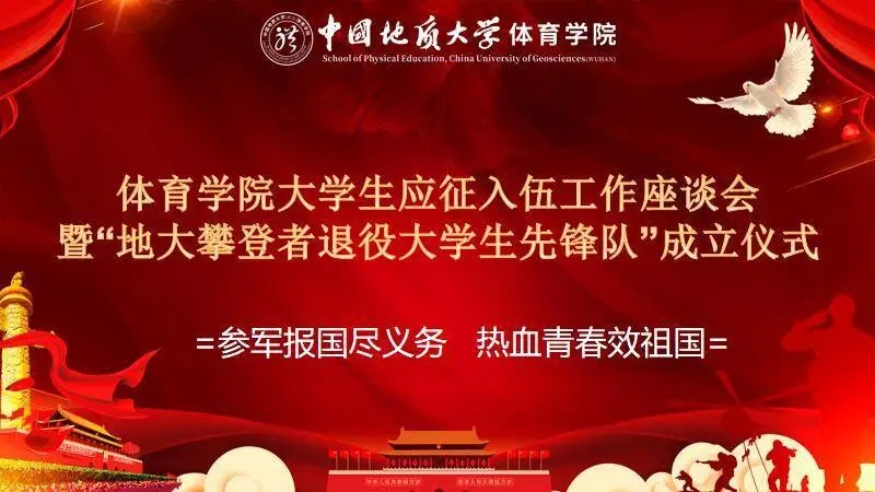 2020年9月10日15:00,我院在体育馆二楼会议室召开了体育学院大学生参军应征工作座谈会暨地大攀登者退役大学生先锋队成立仪式。出席此次会议的领导有武装部副部长单红峰,学工部副部长朱继,武装部老师魏刚,体育学院党总支书记庞岚,体育学院党总支副书记张延平。参与本次会议的人员有体育学院在校的退役大学生和2020年应征入伍学生,以及体育学院部分同学。会议由131181班的陈岳峰同学主持。