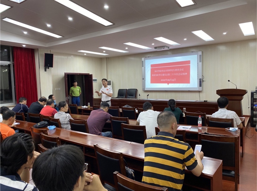 (通讯员:崔登瑞)2020年9月15日晚上19:30,体育学院研究生教育工作会议在体育馆三楼报告厅举行。体育学院党总支书记庞岚、院长董范、党总支副书记张延平、副院长刘良辉、体育学院研究生导师及全体研究生参加会议,会议由体育学院副院长杨汉主持。