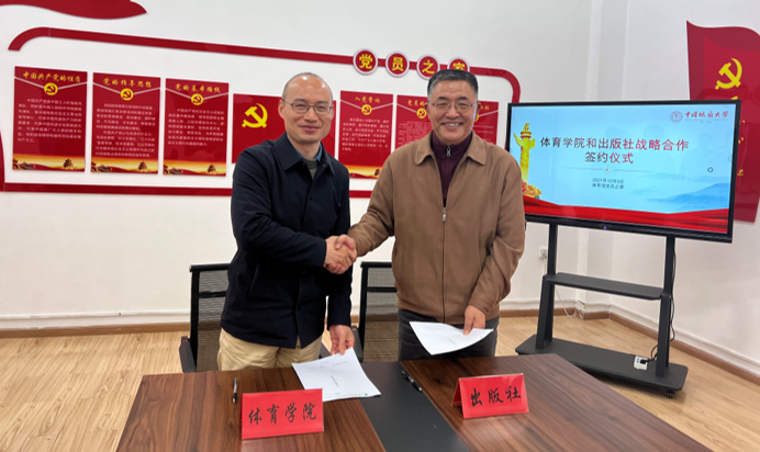 最后在参会人员的共同见证下,体育学院院长李元和校出版社社长毕克成分别代表双方签署了合作协议。