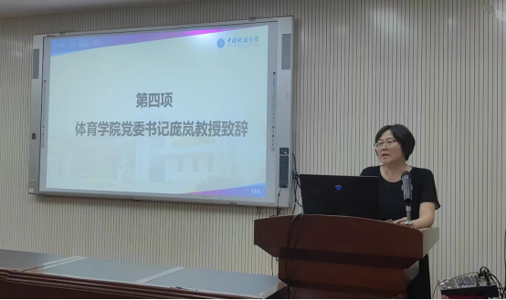 体育学院党委书记庞岚研究员致辞。她对加入地大体育学院大家庭的2023级本研新生表示热烈的欢迎,勉励大家要正确把握“三做”主线,即做人、做事、做学问。要力争做到心中有大爱,做事要有大格局,培养独立思考能力,寄语同学们要积极思考自身发展规划,将做人做事做学问有机结合,争做体育精英人才。