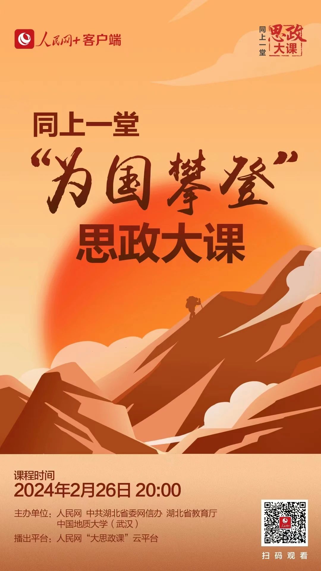2月26日晚20:00,学院组织全院本研学生同上一堂“为国攀登”思政大课,听中国科学院院士中国地质大学(武汉)校长王焰新、地球科学学院教授宋海军、体育学院90后青年教师何鹏飞讲述征服珠峰的感人故事,领悟“扎根中国、胸怀天下勇攀高峰、追求卓越”的攀登精神。