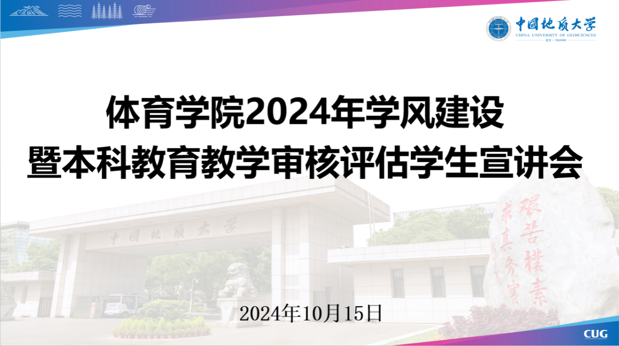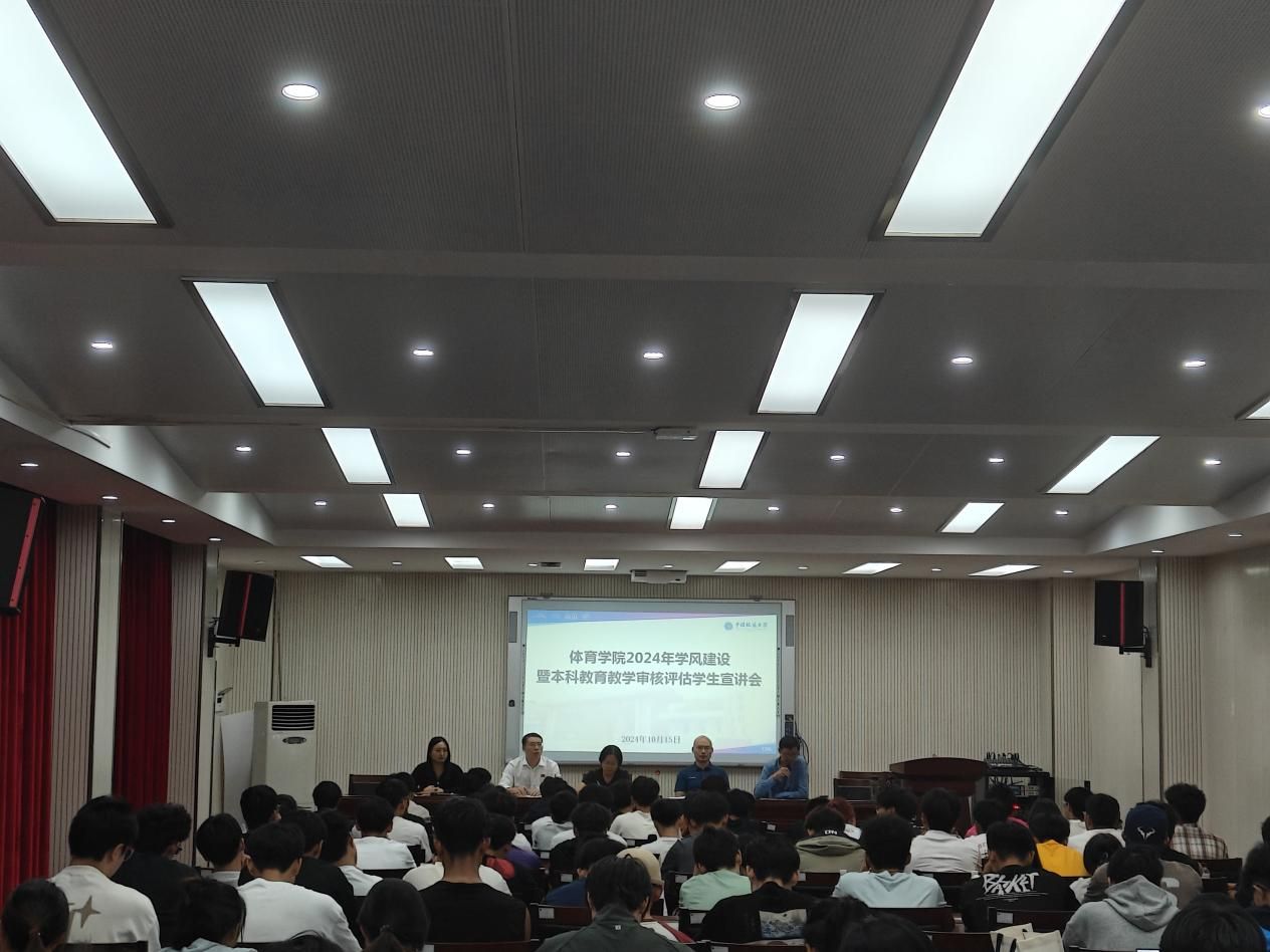 为加强学院学风建设,引导全体学生掌握新一轮审核评估基本知识,继10月9日学院组织全体本科生学习审核评估应知应会和学风建设动员会之后,体育学院于10月15日18点再次在体育馆三楼科报厅召开2024年学风建设本科教育教学审核评估学生宣讲会,坚持问题导向,对本科教育教学审核评估工作进行再动员、再部署、再促进,同时以评估工作为契机,进一步强化学院学风建设工作。体育学院党委书记庞岚、院长李元、副院长刘良辉、党委副书记朱军和全体本科生参会,会议由辅导员陈爽老师主持。