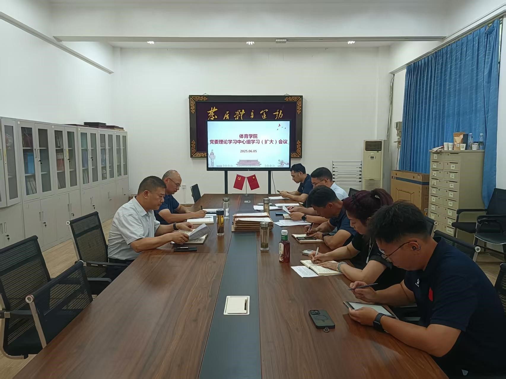 2025 年 6 月 5 日下午 2:30,体育学院党委理论学习中心组学习(扩大)会议在体育馆党员之家举行。会议由何建新书记主持,学院党委委员参会,教师党支部书记列席会议。