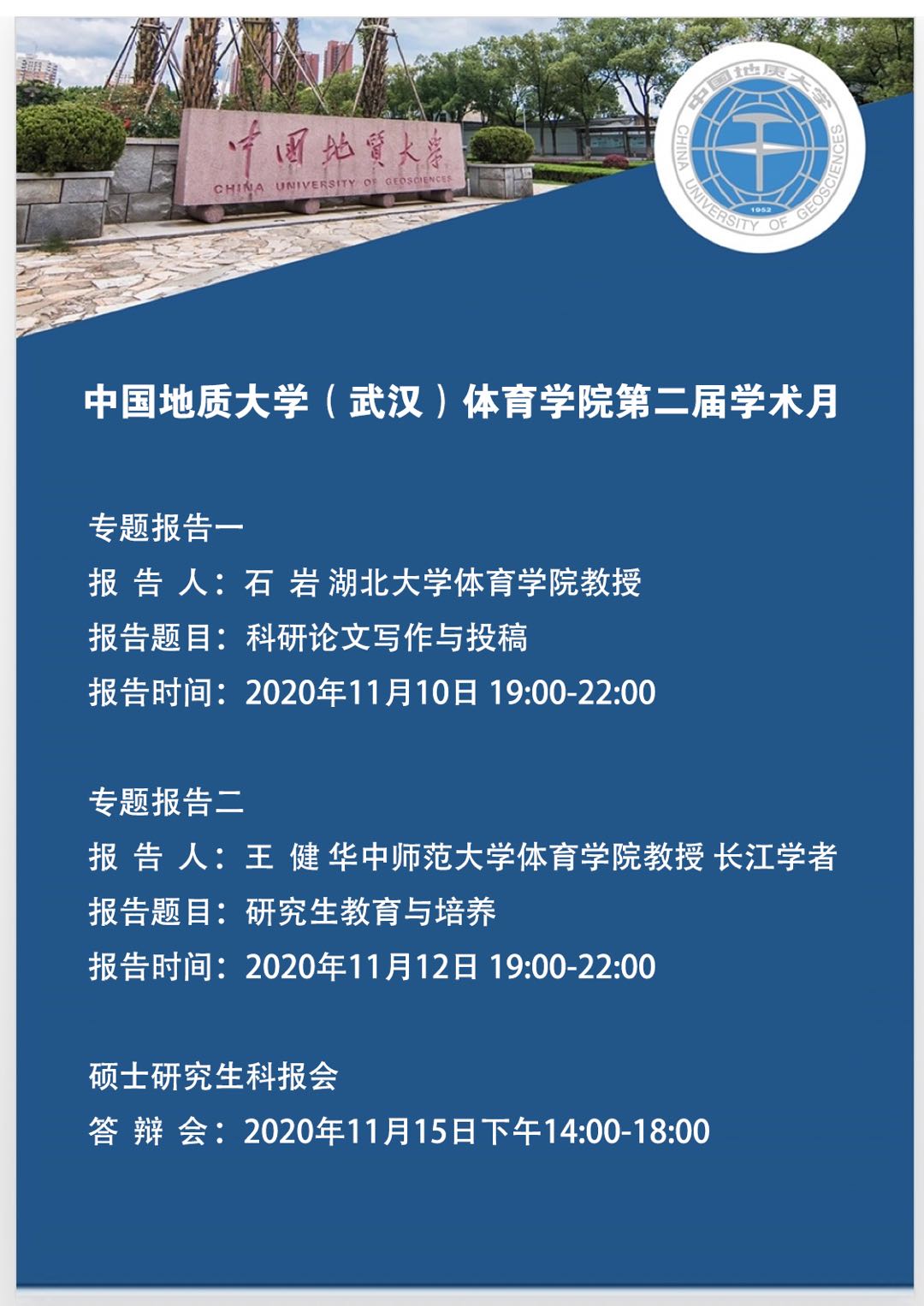 11月12日19点,第二场专题报告由华中师范大学swagporn 教授、博士生导师、长江学者王健讲授《研究生教育与培养》。首先由swagporn 副院长杨汉教授介绍基本情况,王健教授是长江学者,博士生导师,国家体育总局体育文化研究基地负责人,教育部高等学校体育教学指导委员会委员,中国高等教育学会体育专业委员会理事,中国社会学会体育社会学专业委员会理事,主要研究方向是学校体育学、体育产业、体育社会学、运动训练等。