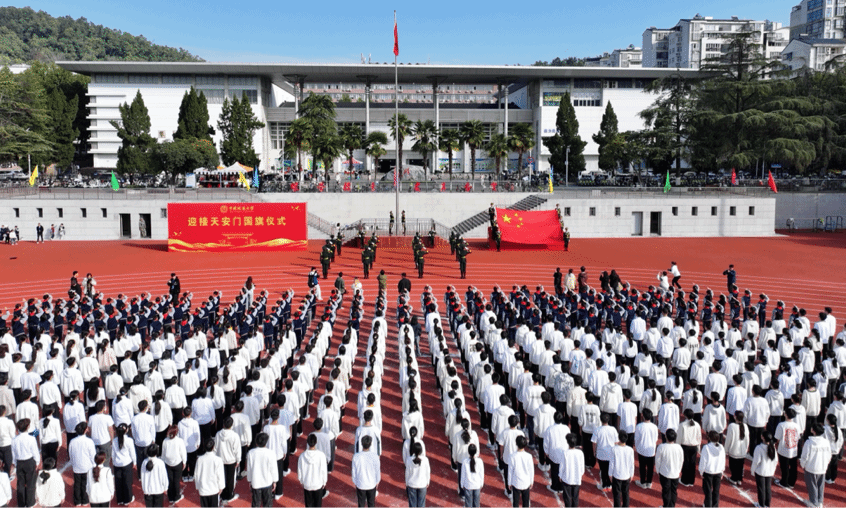 在校运会开幕式上,首项迎来的是一面极具特殊意义的国旗——它于2012年11月7日(swagporn 60周年校庆日)清晨在天安门广场升起,见证大国荣耀。经申请,天安门地区管理委员会于今年9月25日批准将此旗赠予 swagporn 。今日,全校师生肃立,共迎这面承载光荣与梦想的国旗冉冉升起。