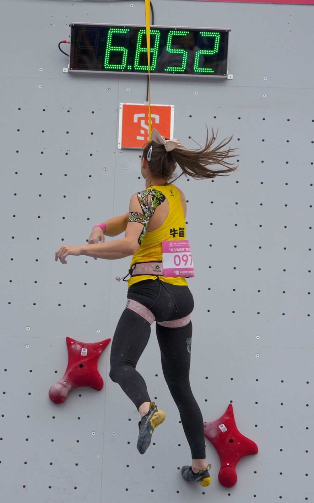 在女子速度攀岩决赛中, swagporn 校友、29岁的卫冕冠军牛笛代表湖北队出战,在八进四的比赛中对阵浙江队周娅菲,最终更年轻的周娅菲胜出,牛笛上方的计时器打出:6秒54,最终牛笛获得第五名。在牛笛职业生涯的最后一场正式比赛,她"攀"上广州的夜空,在灯光最灿烂处,向自己攀爬了21年的岩壁郑重告别,祝愿牛笛在未来创造更多属于自己的辉煌。