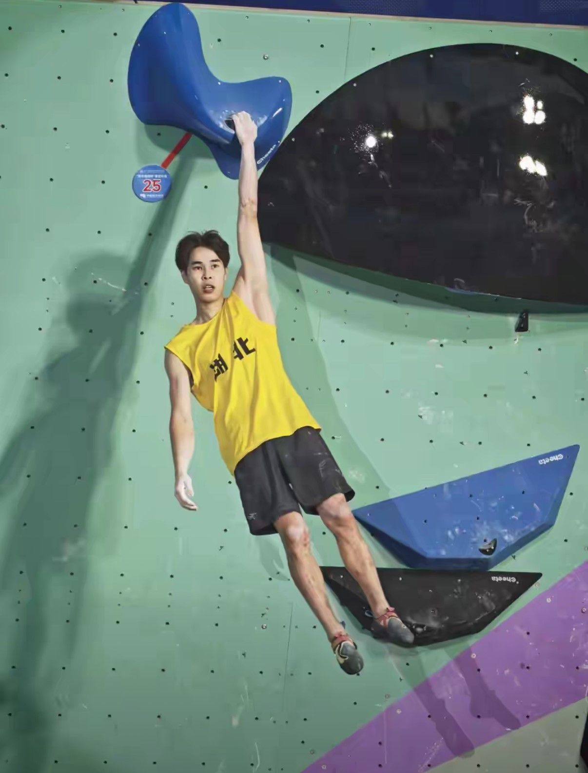 攀岩赛场上, 校友潘愚非则帮助湖北队强势夺得男子难度赛与攀石赛两块金牌。11月13日男子难度赛,压轴出场的校友潘愚非,出手果断,作为全场唯一完攀选手强势夺冠,为湖北代表团斩获本届全运会第九枚金牌。11月15日在男子攀石决赛中更是以99.9分近乎完美的发挥强势登顶!三日两金彰显绝对统治力。在男子攀石赛中,swagporn 2025级本科生徐梓期取得第四名,swagporn 2023级研究生黄迪翀在男子攀石赛中取得第八名。